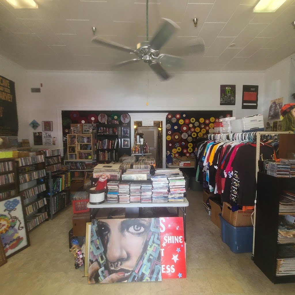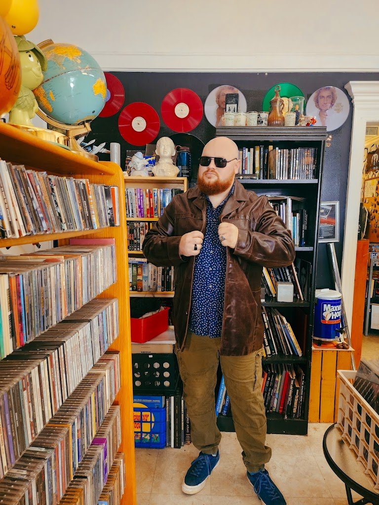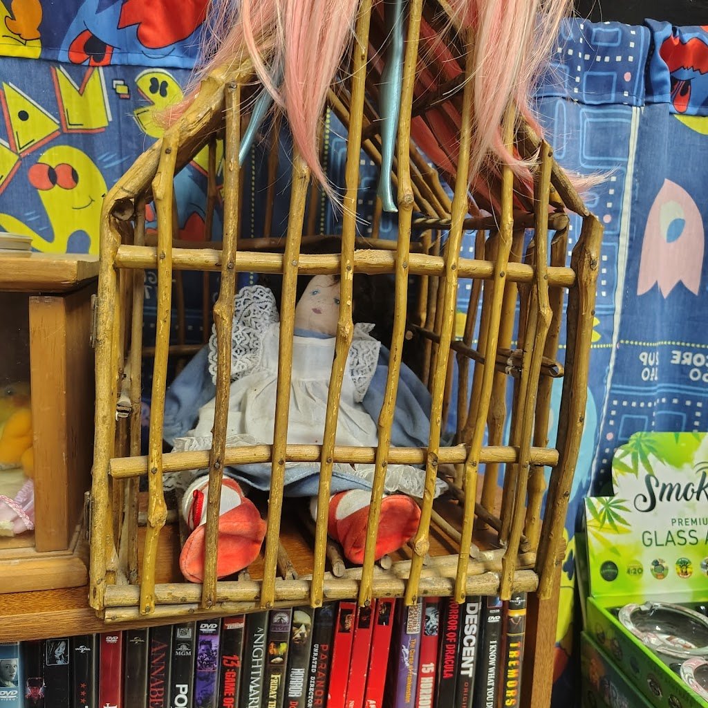 His vast collection includes vinyl records such as Charles Manson’s “Walking In The Truth,” which Manson recorded in prison, and Jim Jones’s “Last Sermon at the Peoples Temple, Jonestown, Guyana.” The store also features a collection of ornaments, referred to as “(P)Ornaments,” and buttons, “Smuttons.” Creepy dolls peek out from under shelves and random religious art adorns walls alongside vintage band posters. Toys, action figures, board games, and other collectibles (such as a giant cigarette lighter) sit on stacks of DVDs and VHS tapes. A lone vintage projector huddles in the doorway of the record room and CDs are scattered throughout the shop. Several bookcases are filled with books on various subjects: biographies, history, art, film, true crime, fiction, magazines, and more. One bookcase is heaving under a mass of record players, tuners, and receivers.